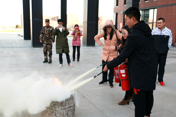 随后,各位同学来到A01广场集合。总务部提前在广场准备好燃油、铁桶、木材、手套、灭火器等物资。同学们在王海洋指导员及各位消防官兵的指引下,两人一组学习使用灭火器。